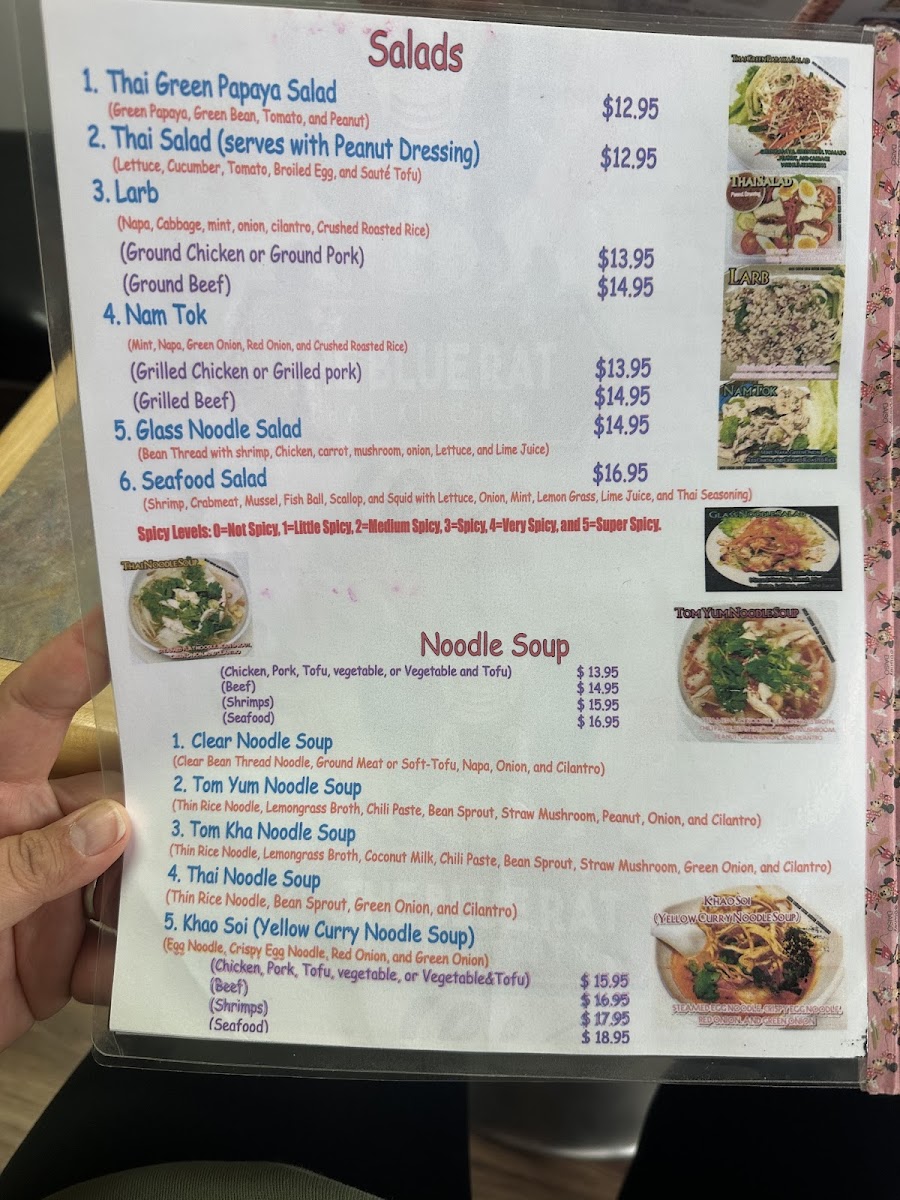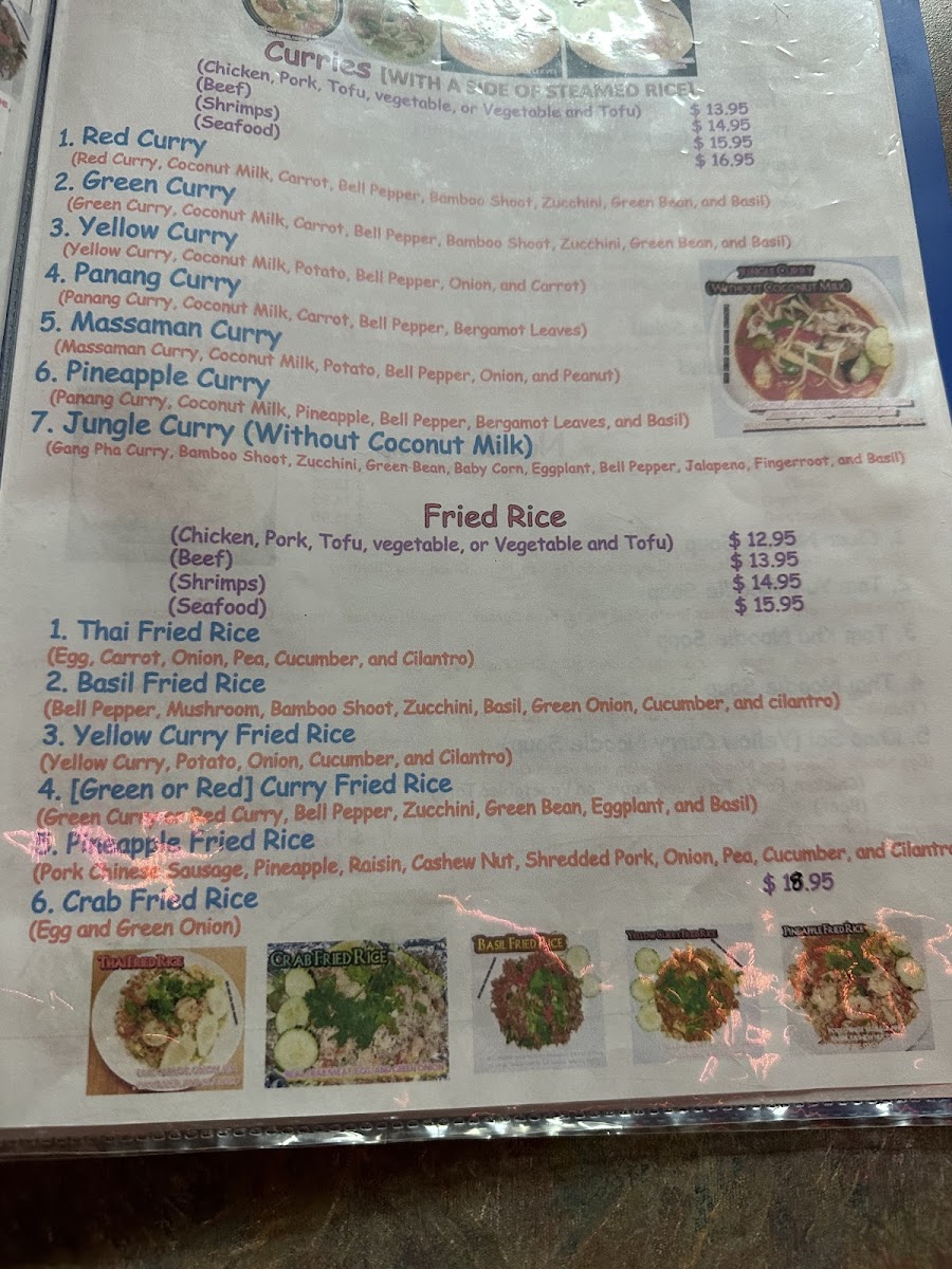 For noodle enthusiasts, the menu boasts mouthwatering options like the Drunken Noodle, bursting with vibrant veggies and savory sauces, or the comforting Clear Noodle bowl, enriched with crispy, colorful toppings. Don't forget to try their refreshing beverages, including the aromatic Thai Tea, perfect for complementing your meal.